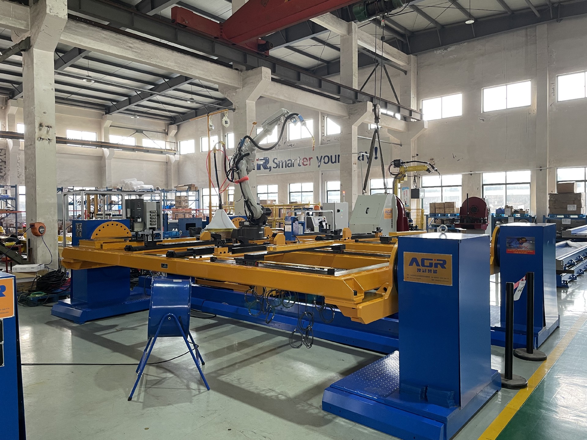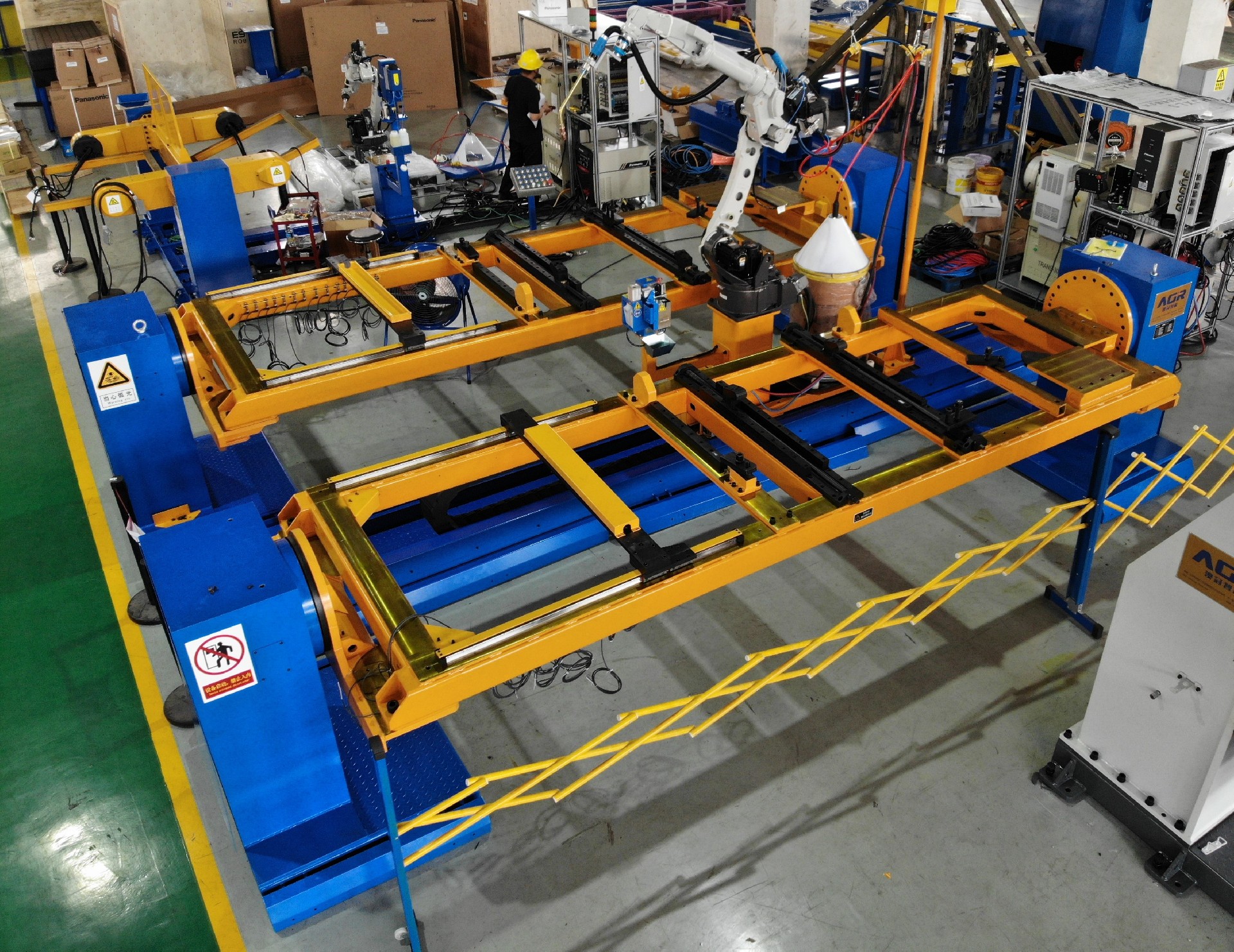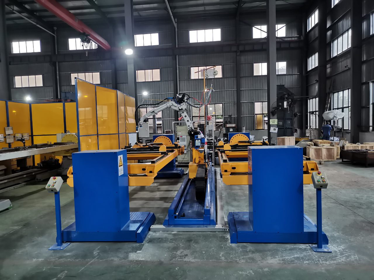 風電運輸架焊接機器人工作站,采用一軸行走正裝機器人,不僅擴展了機器人的工作空間,還通過單軸雙工位交替工作模式提高了生產(chǎn)效率。