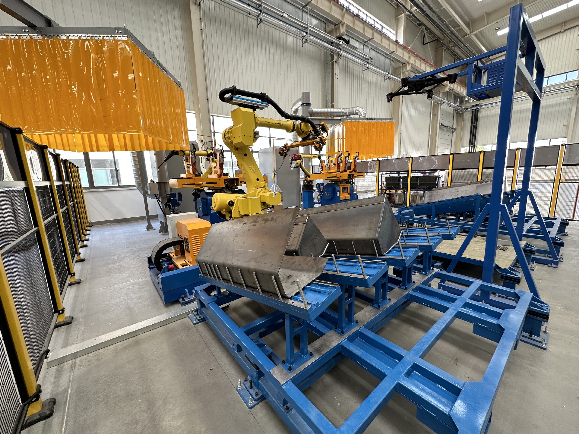 本工作站配備2臺(tái)焊接機(jī)器人、1 臺(tái)搬運(yùn)機(jī)器人、2套兩軸變位機(jī)、4 套組對(duì)工裝、1套搬運(yùn)機(jī)器人地軌、1套抓手、2 套旋轉(zhuǎn)立柱除塵系統(tǒng)、1 套視覺系統(tǒng)、1套電氣系統(tǒng)及對(duì)應(yīng)輔助設(shè)備,以自動(dòng)化代替人工,提高焊接效率和質(zhì)量。
