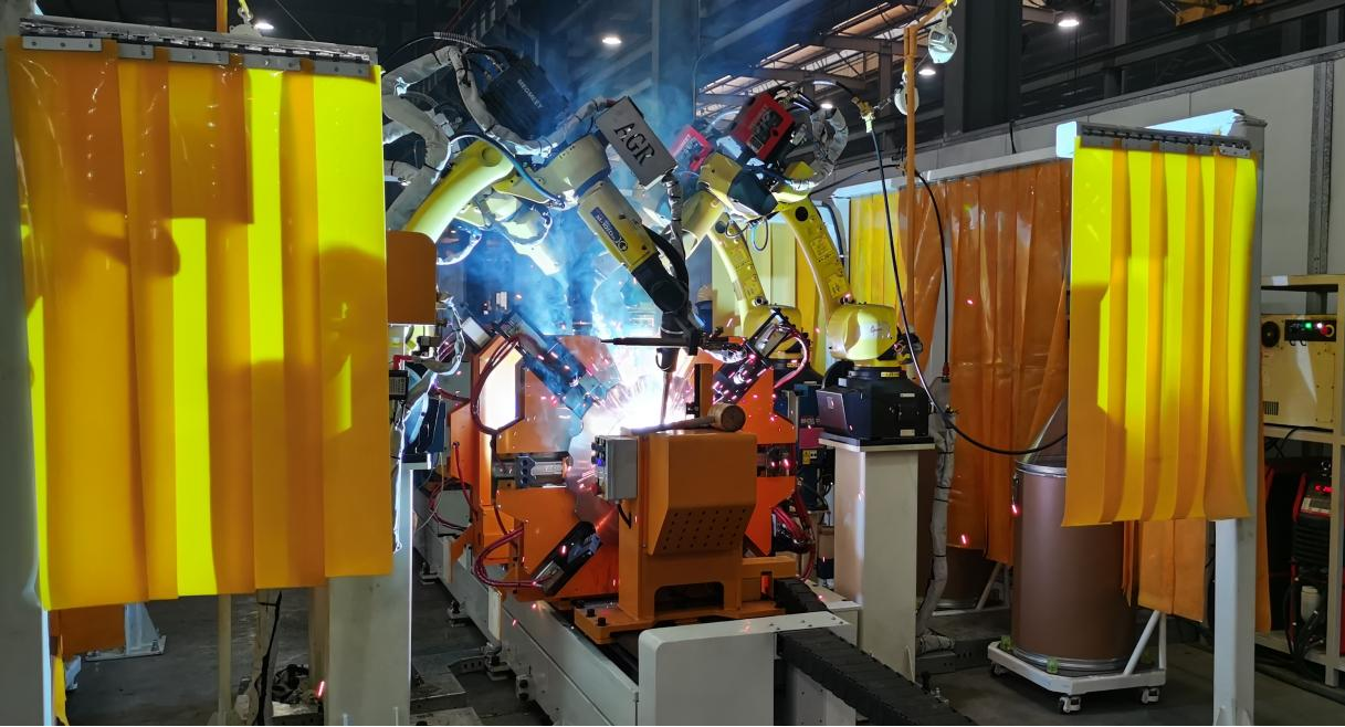 (3)焊接位配置四臺(tái)機(jī)器人,其中兩臺(tái)負(fù)責(zé)烤火預(yù)熱,全部四臺(tái)兼責(zé)點(diǎn)焊與焊接工作。