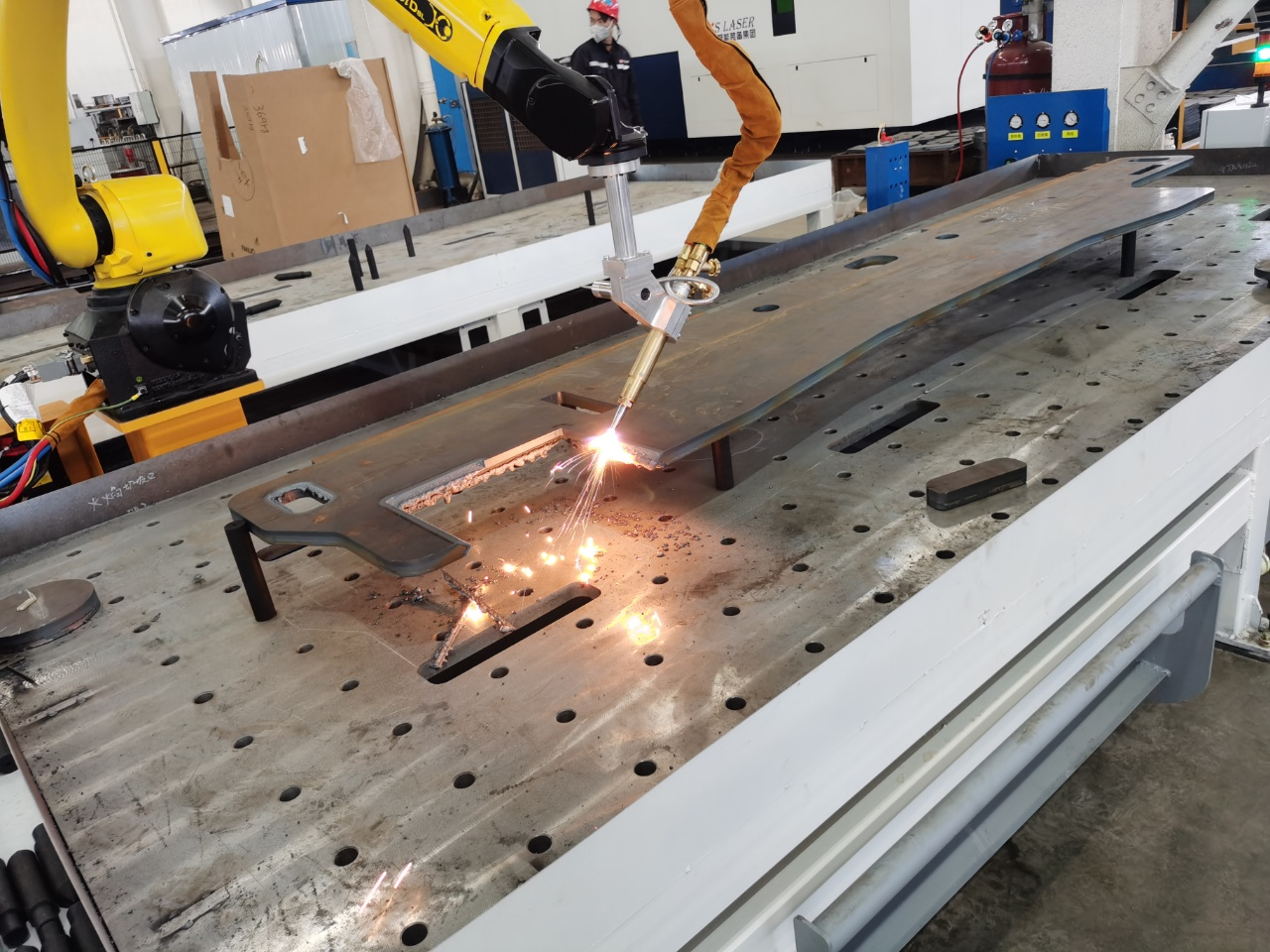 ①高精度聯(lián)動:發(fā)那科機器人 + 一軸地軌,擴展切割范圍