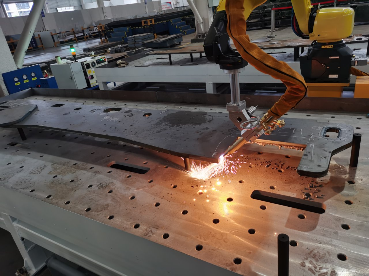 行業(yè)背景:火焰切割因其能高效處理厚鋼板而不可或缺。然而,這些行業(yè)使用的板材往往尺寸巨大、形狀不規(guī)則,且在吊裝、運輸或存儲過程中極易發(fā)生變形和移位。傳統(tǒng)的人工劃線定位或簡易夾具定位方式,不僅效率低下、勞動強度大,更難以克服板材實際位置與理論位置的偏差,導(dǎo)致切割路徑偏移,造成材料浪費、工件報廢甚至返工。