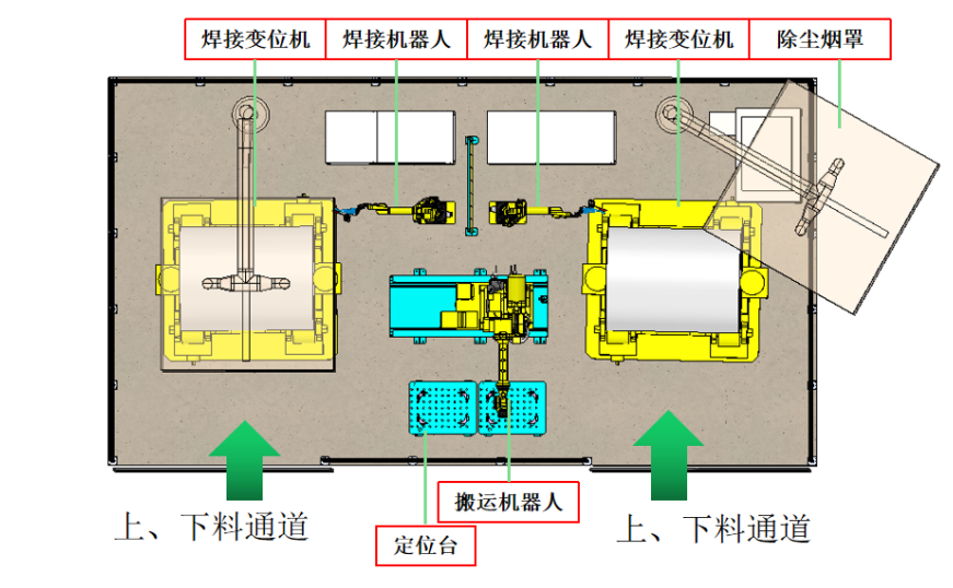 工作站包含雙工位,由兩臺焊接機(jī)器人分別對應(yīng)每個工位的焊接任務(wù)。焊接的是兩種產(chǎn)品,搬運(yùn)機(jī)器人負(fù)責(zé)自動拼點(diǎn)任務(wù)。