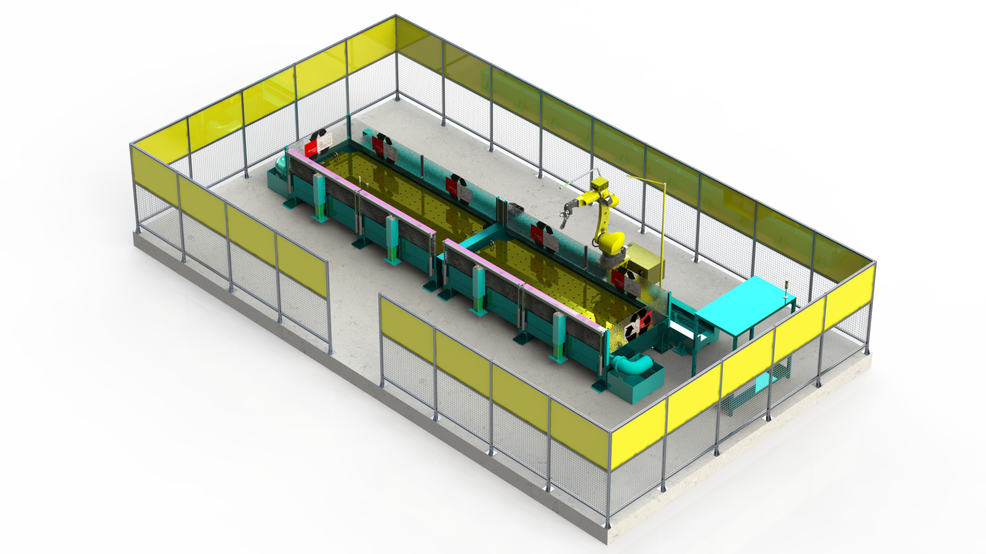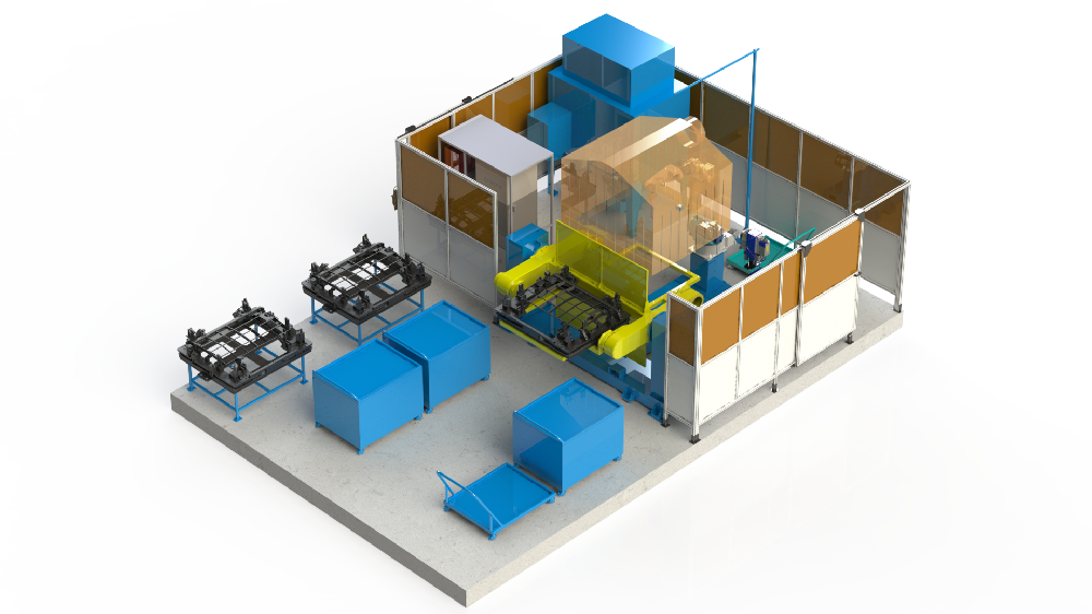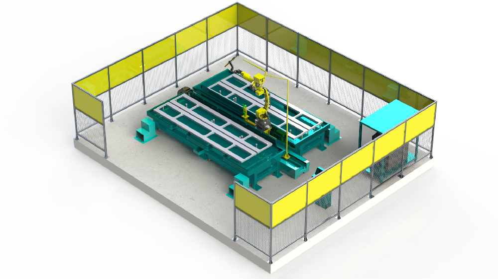 5機(jī)聯(lián)動機(jī)器人焊接系統(tǒng);變位機(jī)承載能力達(dá)到1噸,適用于多型號動臂斗桿結(jié)構(gòu)件的焊接;反變形及夾緊定位一體化設(shè)計伺服夾具,與工件自 動化柔性輸送系統(tǒng)配合,可實(shí)現(xiàn)多種型號工件的自動裝夾。