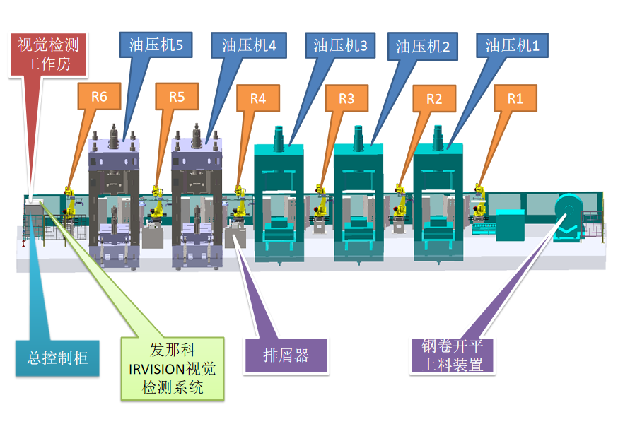客戶要求對(duì)割草機(jī)殼體油壓機(jī)工件的加工從上料到檢測(cè)、碼垛全程實(shí)現(xiàn)無(wú)人化、自動(dòng)化。產(chǎn)線配備6臺(tái)發(fā)那科6軸機(jī)器人 ,5臺(tái)油壓機(jī),1套鋼卷上料系統(tǒng),1套視覺(jué)系統(tǒng),6套末端執(zhí)行系統(tǒng),5臺(tái)相機(jī)加鏡頭,電氣控制等組成。